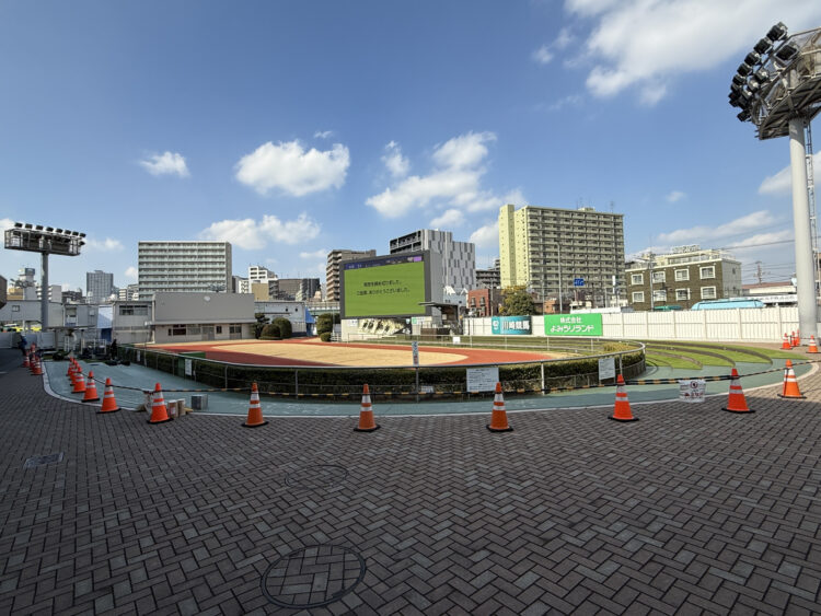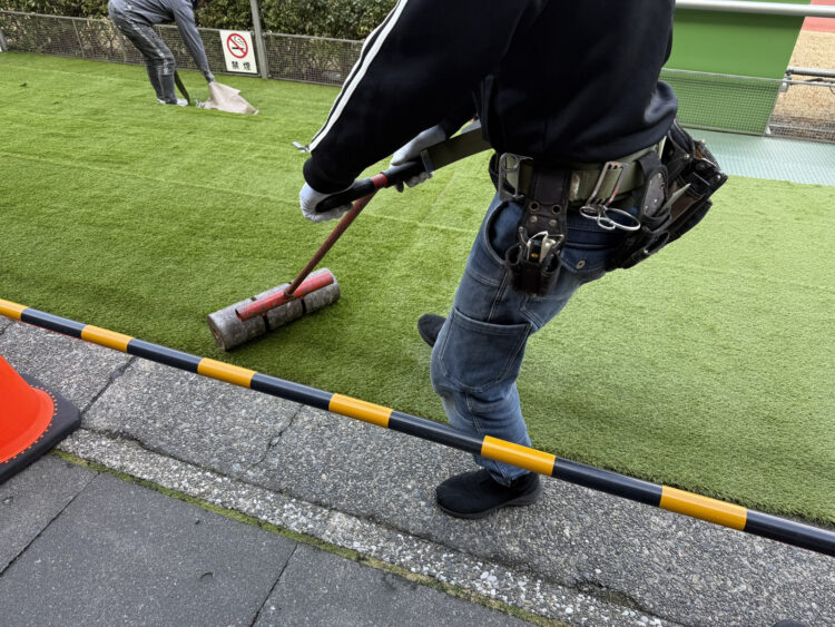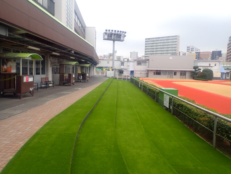 川崎競馬場パドックの観客席(約660㎡)の人工芝敷設が完了!難易度の高い曲線・階段施工も14日間で完工