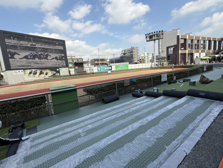 川崎競馬場のパドックにて、観客席約660㎡の人工芝施工を無事完了いたしました。