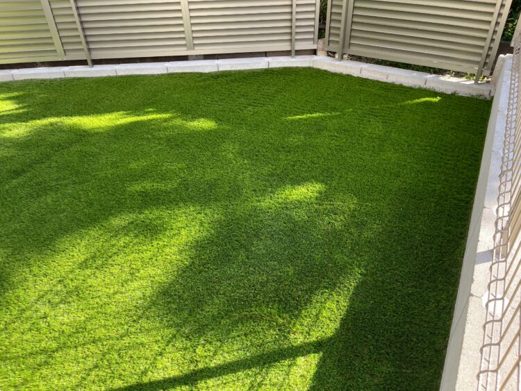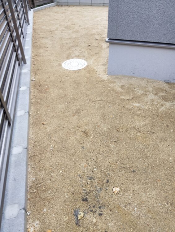 排水桝の処理: 目立つ位置にあった2か所の排水桝は、人工芝を被せる加工を施し、景観を損なわない「隠す仕上げ」を行っています。
