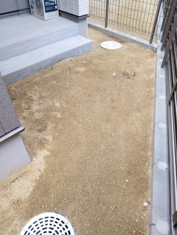 新築時のお庭によく見られる「地面の大きな凸凹」がある状態でしたが、まずは徹底した整地作業から開始。ご家族が安心して歩けるよう、平坦で美しい下地を作り上げました。